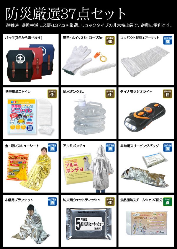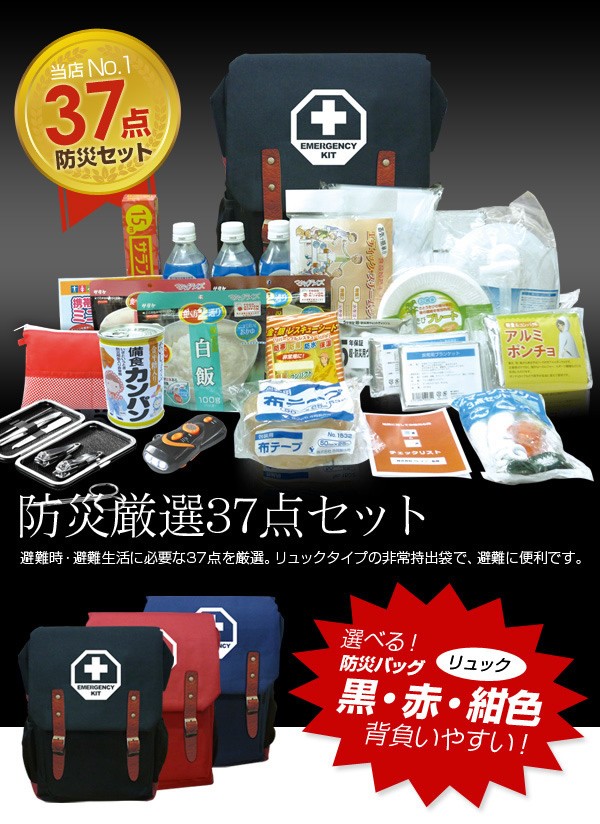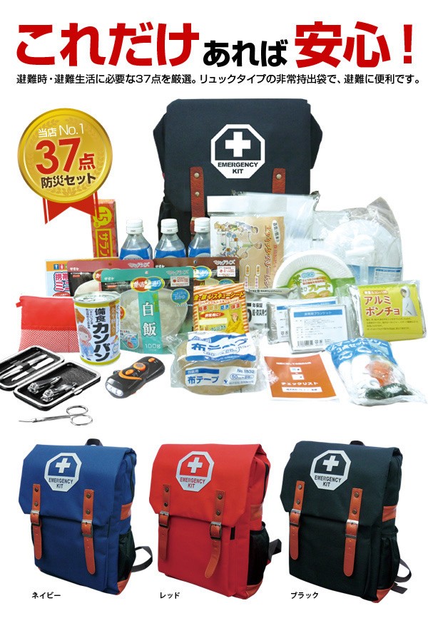 リュックサックに収納するタイプで両手が使えて大変便利!!被災時に必要な37点を厳選しました。リュックはネイビー、レッド、ブラックの3カラーをご用意しました。 |