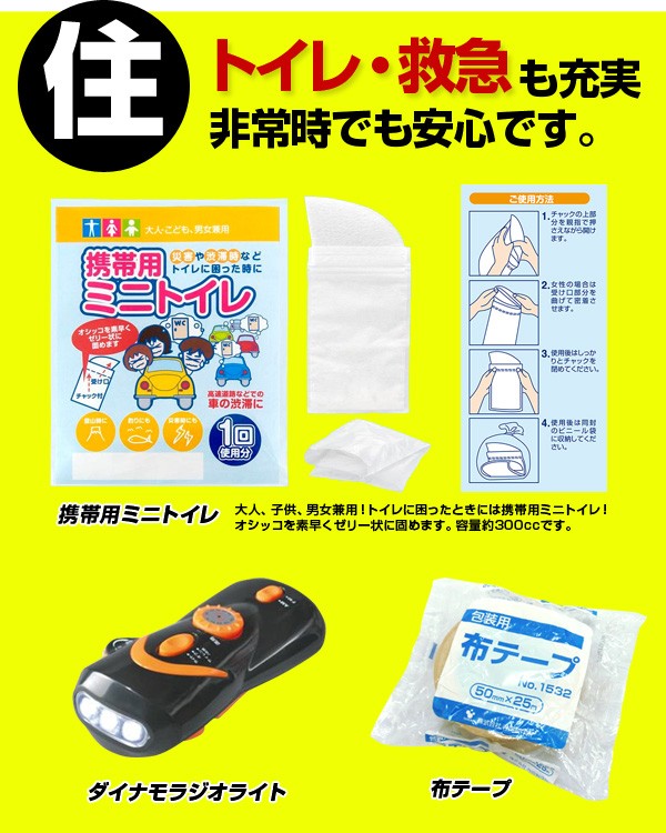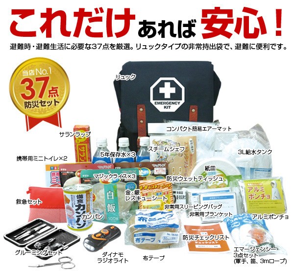 | セット内容 | リュック、3wayダイナモラジオ(ライト・ラジオ・充電)、軍手、ホイッスル、ロープ3m、アルミポンチョ、非常用ブランケット、給水タンク3L、保存水500ml×3本、マジックライス×3食、カンパン、救急ポーチセット、グルーミングセット、スチームシェフ3回分、紙皿15枚、サランラップ15m、布テープ、非常用スリーピングバッグ、携帯用ミニトイレ、金銀レスキューシート、防災用ウェットティッシュ、コンパクトエアーベッド、防災チェックリスト、取扱説明書 |