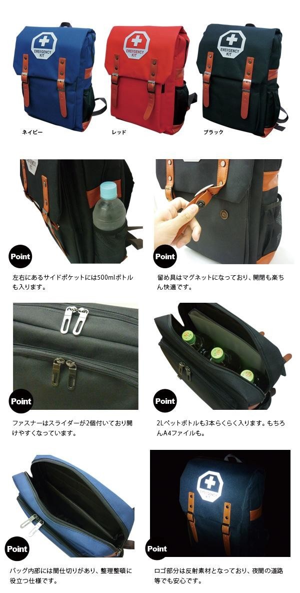 | リュックサックに収納するタイプで両手が使えて大変便利!!被災時に必要な37点を厳選しました。リュックはネイビー、レッド、ブラックの3カラーをご用意しました。 |