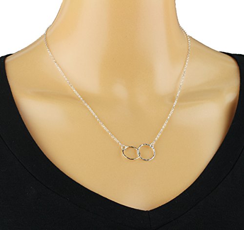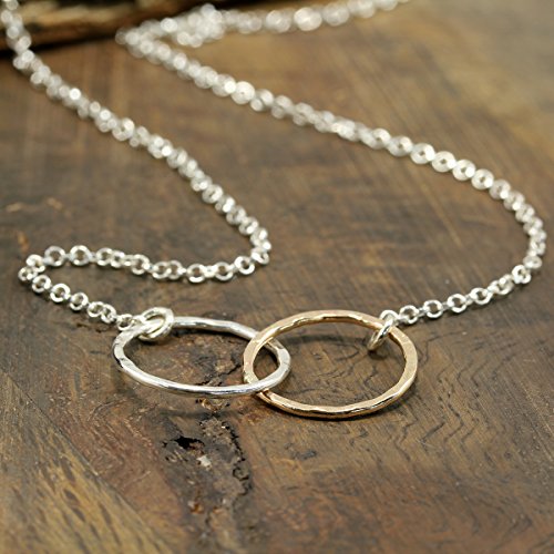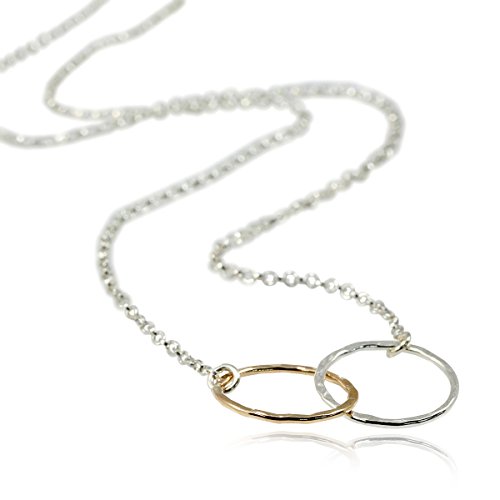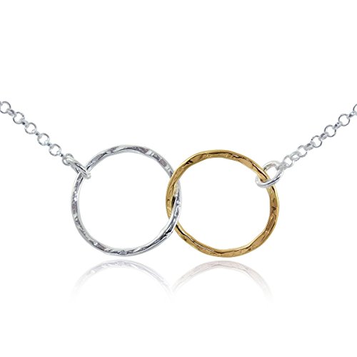 Graceful eternity or figure 8 necklace. 925 Sterling Silver infinity necklace with two-tone Silver and 14K Gold Filled double interlinked circles. Two petite interlinked hand hammered circles one in 14K Gold Filled and the second in 925 Sterling Silver hanging on a Sterling Silver link chain. Each circle measures about 1/2" in diameter. Artisan handmade.
