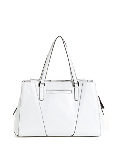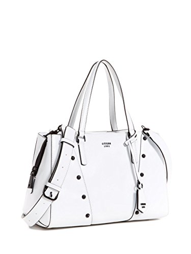 Saffiano faux-leather satchel is complete with matte black logo hardware, center zipper compartment, multipurpose pockets and studded accents. Removable tag charm.Feature