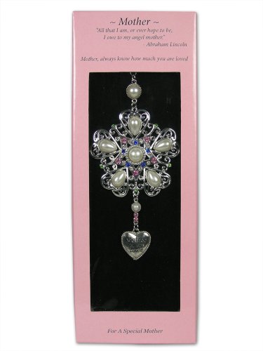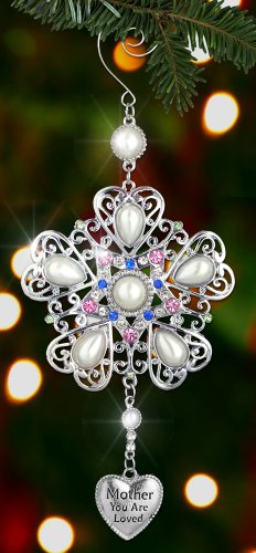 MOTHER ORNAMENT. Beautiful silver filigree ornament with jewels and pearls. Snowflake designs with a silver hanging heart charm engraved with the saying "Mom you are loved". Loving saying for you mother, mother-in-law, new mother, mother-to-be or a step mom.