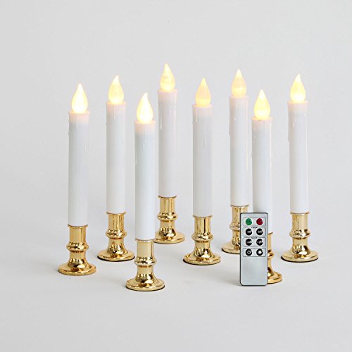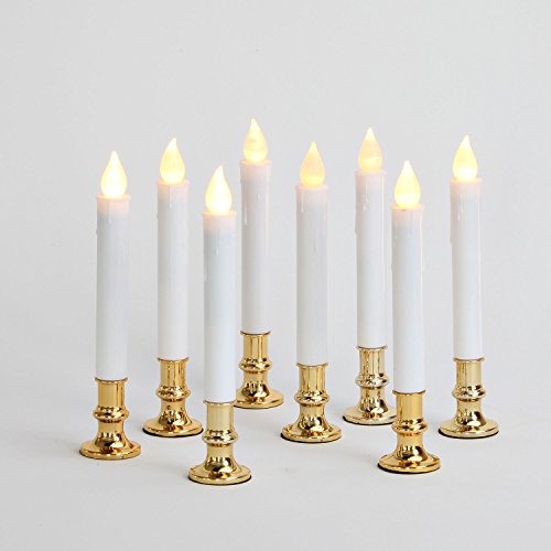 Set of 8 Flameless Plastic White Taper Candles with Gold Removable Candleholders and Remote
