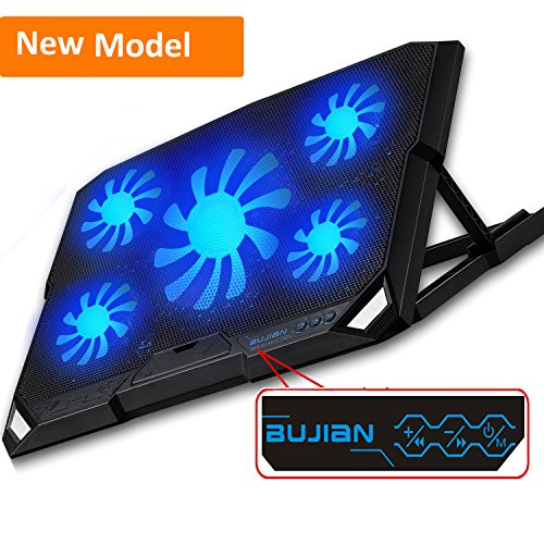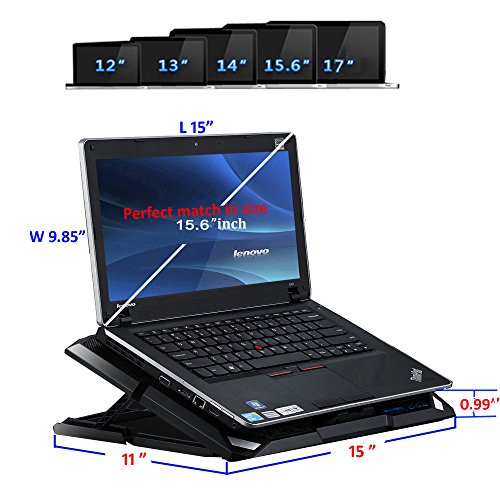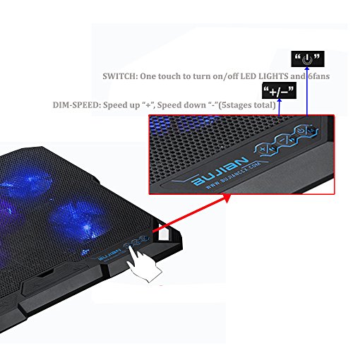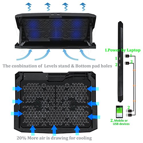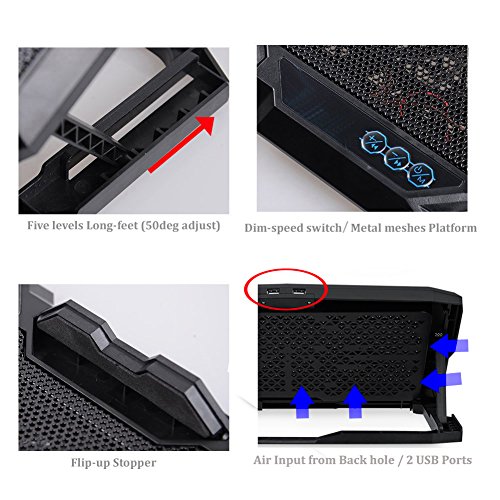 -. Feature : [LAP USE SLIM&LIGHT]: designed for Gaming use,portable for 13-17inch laptops."0.99inch ultra-thin" and 2pound weight is perfect for LAP USE COOLING. / [FIVE TIMES AIR]: Decent airflow for cooling is provided by powerful 5fans(2"x4fans,5.6"x1fan spinning at 1200-2000RPM). Also Copper-coil winding feature can bear thousands of spinning to ensure a longer lifetime. / [FRONT TOUCH SWITCH DIM-SPEED]: Just one slight touch to turn off all "LED GLOW" and all 5fans. and the speed can be adjustable in 5Levels so energy-saving . / [PERFECT VISUAL&TYPING ANGLE]: Adjustable 5Levels-Stand(10deg each) ensures A better visual or typing angle to relieve wrists&shoulder aching. MORE AIR is pulled from backside gap,and u can apprantely feel the air through the pad holes. / [EXTRA USB Ports]: One for power supply from notebook, the other for Mobile/U disk,U wont miss any portable USB devices at all with the cool mat.