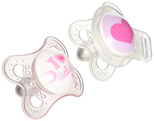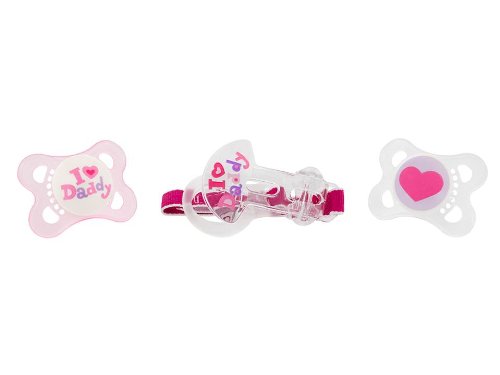 -. Binding : Baby Product -. Brand : MAM -. Color : Pink -. Department : baby-girls -. EAN : 0845296094131 -. Feature : Special value pack includes two BPA-free pacifiers and one matching clip / Curved shield allows the pacifier to sit comfortably on baby's face / MAM Ultra Soft Silicone Nipple stays comfortably in baby's mouth due to the anti-slip texture / Symmetrical nipple ideal for baby's jaw development / Clip helps keep pacifiers clean when not in use and close at hand -. Label : MAM -. Manufacturer : MAM -. Model : 9413-012-0-1 -. MPN : 5726389 -. PackageQuantity : 1 -. PartNumber : 5726389 -. ProductGroup : Baby Product -. ProductTypeName : BABY_PRODUCT -. Publisher : MAM -. ReleaseDate : 2013-10-03 -. Size : 0-6 Months -. Studio : MAM -. Title : MAM Love & Affection Orthodontic Pacifier with Clip Value Pack, I Love Daddy, Girl, 0-6 Months, 2-Count -. UPC : 845296094131