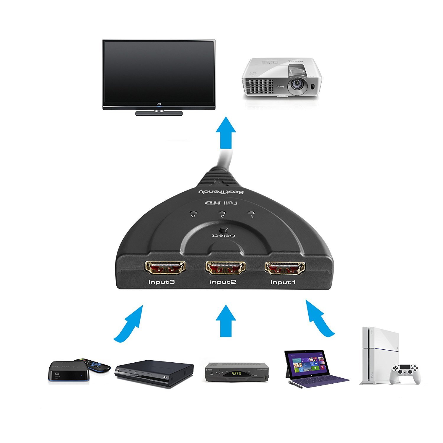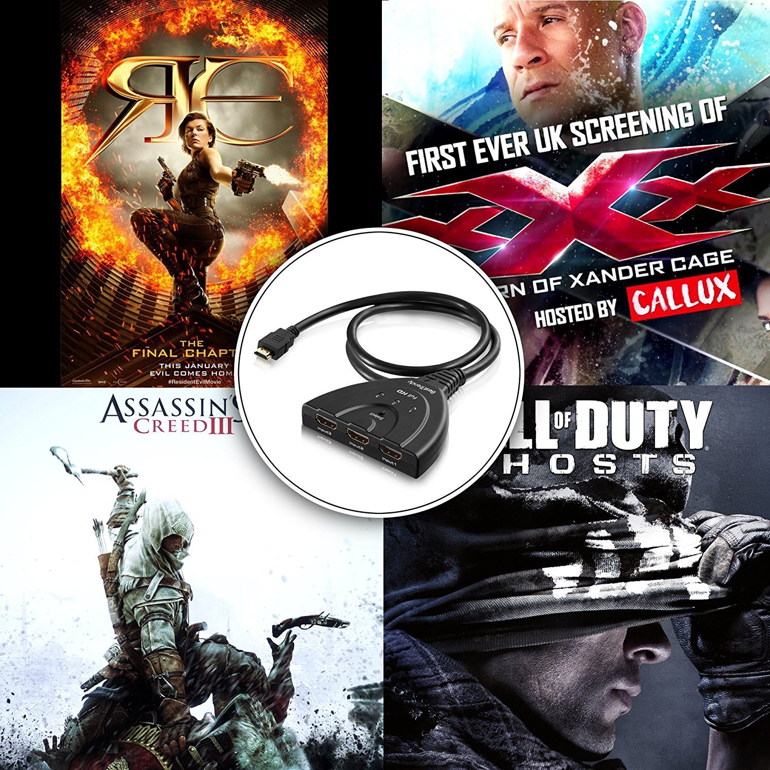 It can correspond with PS3, PS4, Xbox, Apple TV, PS3, PS4, Xbox, LCD TV, DVD Player, PC etc with HDMI 3 input 1 output.