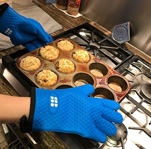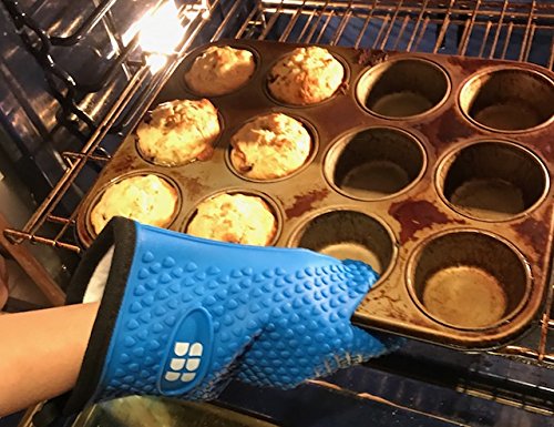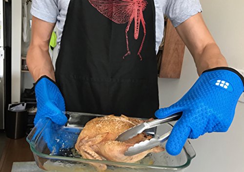 Heat Resistant BBQ Cooking Gloves - Oven Mitts By SBDW. Insulated Silicone With Protective Lining. Versatile & Waterproof For BBQ Grill, Deep Fry, Fire Pit, Campfire & Meat Smoking - 3 Colors (Blue)