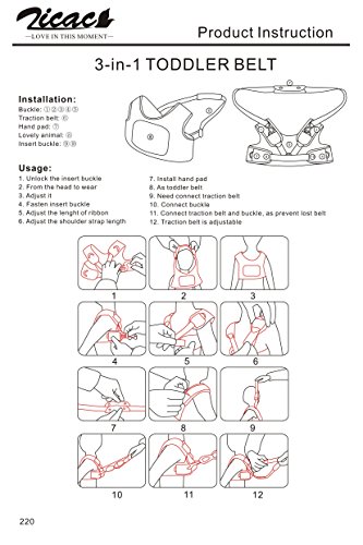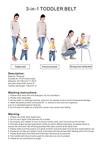 Specification Item Weight: 250g Color: Blue / Yellow / Green / Pink / Coffee Item Brand: Zicac Suitable for 10-48 months Waistline:55-100cm/21.7"-39.4" Shoulder strap width: 6cm/2.4" Traction belt length:130cm/51.3" Features: #1 3-in-1 Toddler Safety Harness Portable High Chair Shopping Cart Safety Strap #2 The front of this harness has a cute animal that squeaks if you press #3 Big bonus: The bottom part of the harness is a reflector which is if you are using this at night people driving will see your child #4 There are 4 buckles, 2 that slides and 2 snaps ,adjust it which you prefer . #5 The straps is padded and make more comfortable to your kids #6 Machine Washable #7 Great for Travel/Home Package Including: 1 * Toddler Safety Harness
