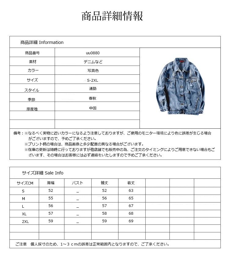 ■素材:デニムなど■カラー:写真色 ■サイズ:S着丈63袖丈52肩幅52M着丈65袖丈56肩幅55L着丈67袖丈57肩幅56XL着丈68袖丈58肩幅572XL着丈69袖丈59肩幅59■原産地:中国