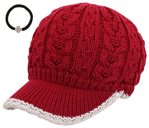 -. Title : Women's Cable Knitted Double Layer Visor Beanie Hats with Hair Tie