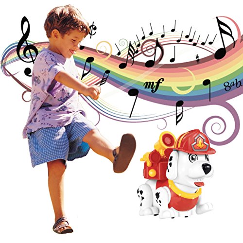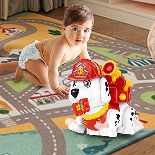 Cute smart dog with infrared remote control.There are 5 key button to control this electronic pet to walk forward and backward,dance and enter fire rescue mode.Kids can play chasing game,dance or help extinguishing a fire with this firehouse dog together.
