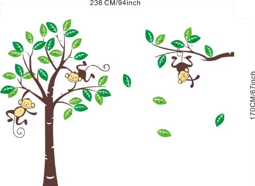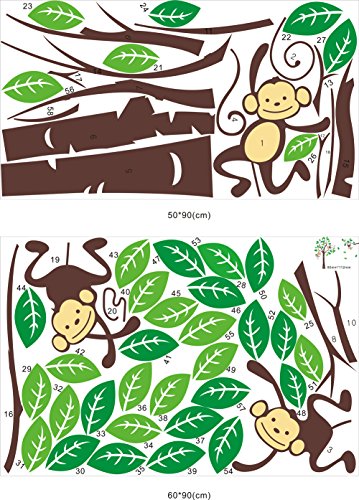 -. Brand : Rainbow Fox -. Color : Multi -. Feature : Applies to any clean/dry/flat surface / Easy to apply, remove and reuse without leaving damage or residue / Comes in 2 sheets, sheet size: 50cm x 90cm(19.7" x 35.4") + 60cm x 90cm(23.6" x 35.4") / The overall finishing size: 2.38m(W) x 1.7m(H) -. Label : Rainbow Fox -. Manufacturer : Rainbow Fox -. MPN : WD00-RF0041-A -. PartNumber : WD00-RF0041-A -. ProductGroup : Furniture -. ProductTypeName : HOME_FURNITURE_AND_DECOR -. Publisher : Rainbow Fox -. Size : A -. Studio : Rainbow Fox -. Title : Cartoon Cute Monkeys Big Trees Removable Wall Stickers Home Decor Decals For Children's Room Nursery, Set Of 2 Sheets, A