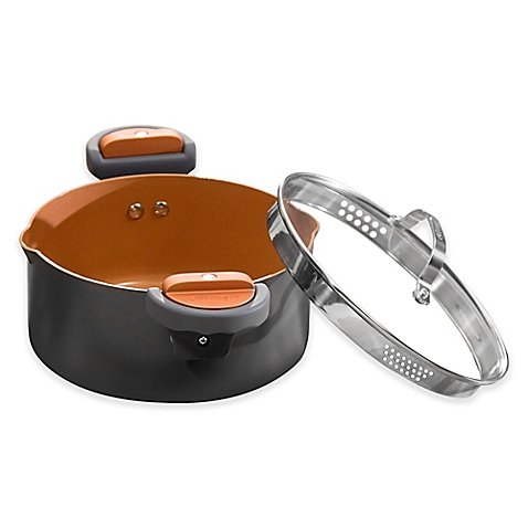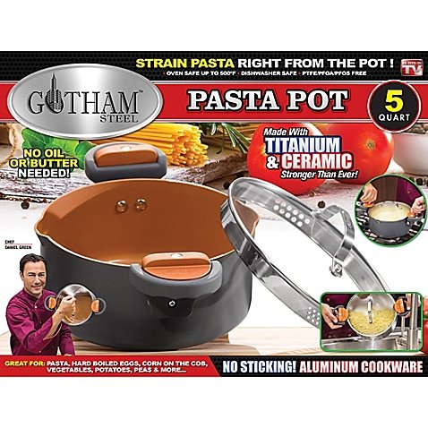 Studio : Gotham Publisher : Gotham Product Description As Seen on TV and endorsed by Chef Daniel Green Gotham Steel Ti-Cerama Nonstick Pasta Pot with Lid delivers effortless food release to let you prepare a wide variety of food without the use of oil or butter for healthier cooking Thermally-efficient aluminum construction delivers rapid, even heating for consistent cooking results Ultra-durable, scratch-proof and metal utensil safe Ti-CeramaTM (ceramic reinforced with titanium) nonstick interior coating is PTHE-, PFOA- and PFOS-free Enamel exterior finish Suitable for use on electric and gas stoves Double-riveted and contoured stainless steel side handles Tempered glass lid Aluminum, steel, titanium and ceramic Dishwasher safe for easy cleanup Measures 13" L x 9.45" W (diameter) x 7" H overall 0