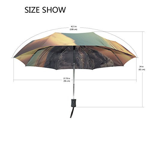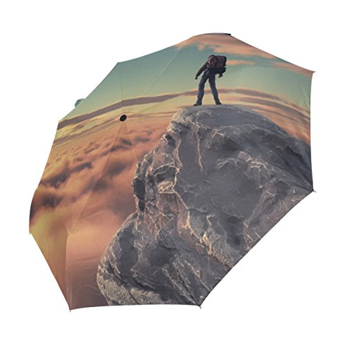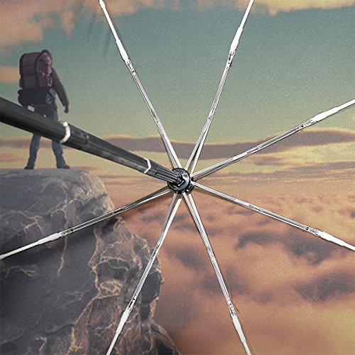 materials: made of 100% polyester pongee waterproof fabric. Weight: it is lightweight, 393g. Single-sided printing. Style: automatic open and close umbrella; foldable mini travel umbrella. Can be used on rainy and snowy day. Suitable for boys, girls, women and man. Feature: Light weight, small, portable. This Young Man Up The Mountain Cloud Sunset Landscape folding umbrella is also a perfect Christmas gift, new year gift, and back to school gift. 0