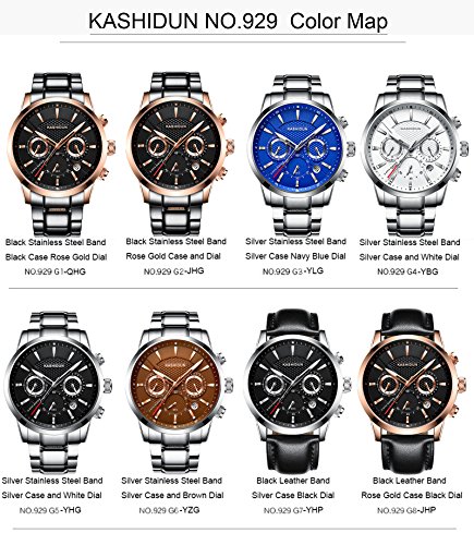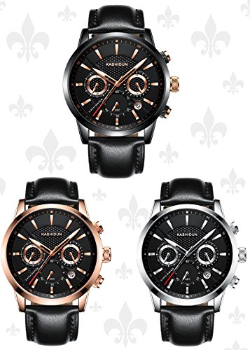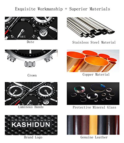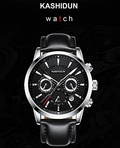 -. Feature : Sporty watch design with Japanese quartz movement / Stylish stainless steel case and black leather band with buckle closure / Chronograph functions and date window(an easy to operate date window is located at 4 o'clock). / Waterproof: water resistant to 30 meters(99 feet), in general, withstands splashes or brief immersion in water, but not suitable for swimming or bathing / Gift Ideas: Business watch with elegant box is a great gift choice to your loved ones for Christmas, birthday, anniversary, Father's Day, graduation and Valentine's Day, Or as a business and party present; If you have any questions, Please feel free to contact KASHIDUN After-sale Service Email: kashidun.ur@hotmail.com