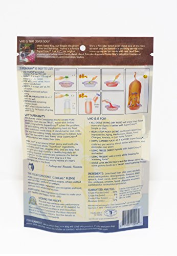 -. Feature : SuperGravy PAW Jus is a savory brown food topper with beef liver and veggies for dogs / Just add water to instantly turn any dog food into a deliciously moist, hydrated meal / Artisan crafted from whole foods for the health of your dog. Enhanced with digestive enzymes and probiotics. No fillers or additives. Gluten free, grain free, GMO free, and glycerin free / Proudly made in the USA | Clear Conscience Pet is the most awarded brand in Pet Nutrition History / 4.5 oz. pouch | Makes 30 gravy servings or 6 quarts of broth