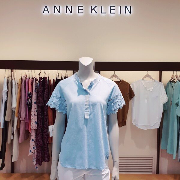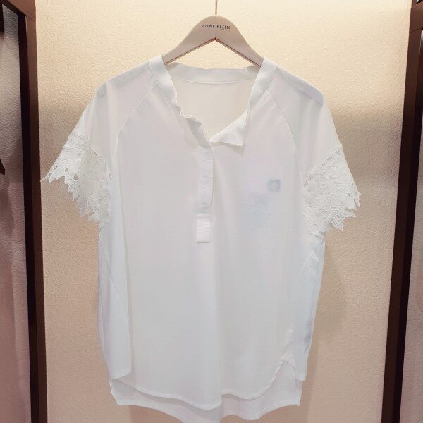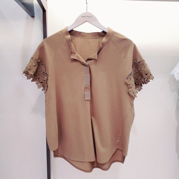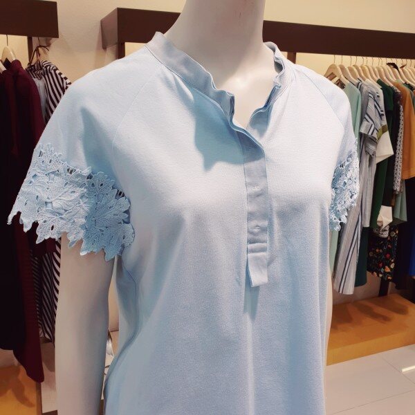 면소재의 부드러운레이스 티셔츠입니다팔부분과넥라인의 포인트로 여성스러우면서도 시원한 티셔츠입니다 스커트와 팬츠의 무난하게 포인트를 주실수있습니다