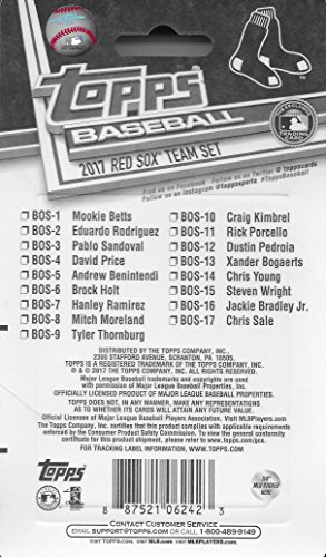 [Product Information]- This is a 2017 Topps Boston Red Sox Factory sealed special edition 17 card team set; cards are numbered BOS-1 through BOS-17 and are not available in packs. Players included are Mookie Betts, Eduardo Rodrigues, Pable Sandoval, David Price, Andrew Benintendi, Brock Holt, Hanley Ramirez, Mitch Moreland, Tyler Thornburg, Craig Kembrel, Rick Porcello, Dustin Pedroia, Xander Bogaerts, Chris Young, Steven Wright, Jackie Bradley Jr. and Chris Sale.
