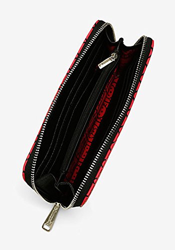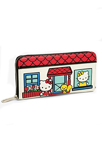 Officially licensed by Sanrio, Loungefly brings the whole Hello Kitty family with you wherever you go with this adorable and colorful wallet! This wallet looks like Hello Kitty's house. Beautiful boutique detailing. Characters and house details are debossed. Embroidered applique window sill. The front side features Hello Kitty, her sister Mimi, and her friend Rorrey. Reverse side has her Papa, Mama, and Joey. This boutique-quality checkbook is made of faux leather with a silver hardware. Zip around closure. 8 card slots, 2 bill-size/checkbook slots, and compartment is divided by a center zippered pouch which makes two additional slots to stash your receipts.Fully lined in red material that is printed with the characters. 8 in x 4 in x 1 in. Vegan friendly.Feature