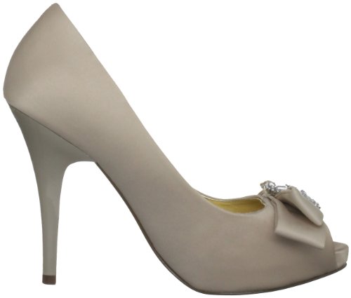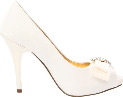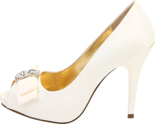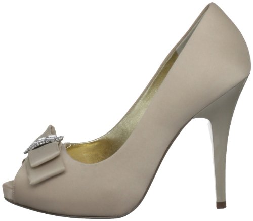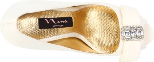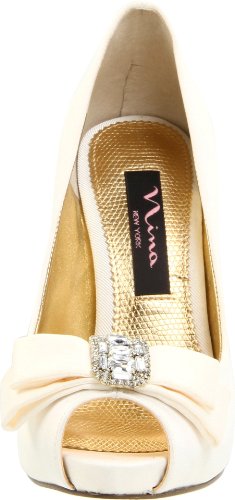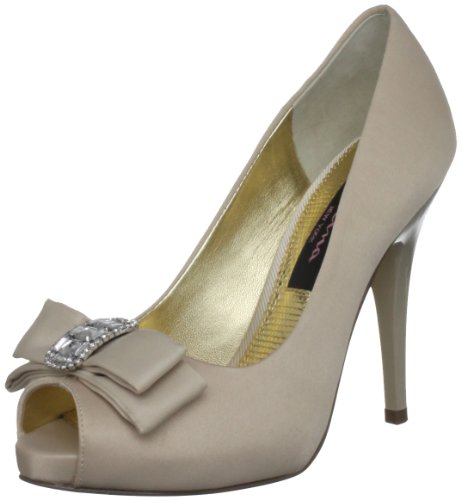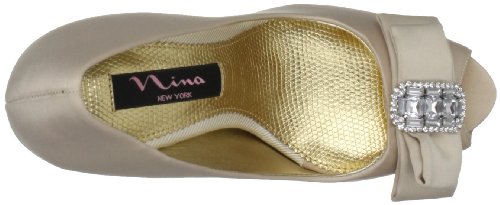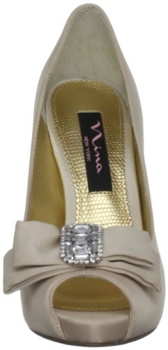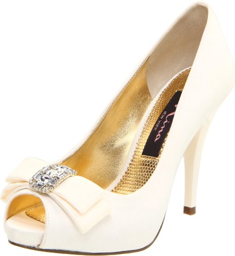 Studio : Nina Publisher : Nina Binding : Apparel Amazon.com Nina's Elke1 is an elegant yet modern accompaniment for weddings, proms and other formal affairs. Topped with a sparkly, rhinestone-centered bow, the shapely pump is crafted from shimmery fabric and features a peep-toe front and flattering low-cut vamp. The matching heel streamlines the silhouette and creates a long, leggy look for your dressiest above-the-knee ensembles. 0