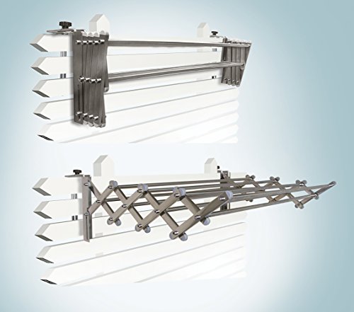Product Description This heavy-duty expandable laundry rack by Greenway has 8 aluminum rods and is great for towels and sheets. It can easily be placed on any balcony, fence, RV, pool shed or in your laundry room or basement. It can be installed in minutes to wood, steel or masonry, and folds away when not in use. It is perfect for outdoor use in the warmer months and indoor use in the colder months. 0