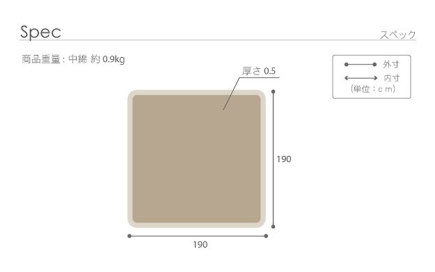 サイズ(cm):190x190cm、厚さ約0.5cm、中綿量約0.9kg