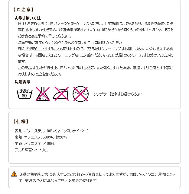 材質:表地-ポリエステル100%(マイクロファイバー)、裏地-ポリエステル80%・綿20%、中綿-ポリエステル100%、アルミ蒸着シート入り(21101251)
