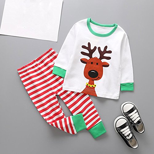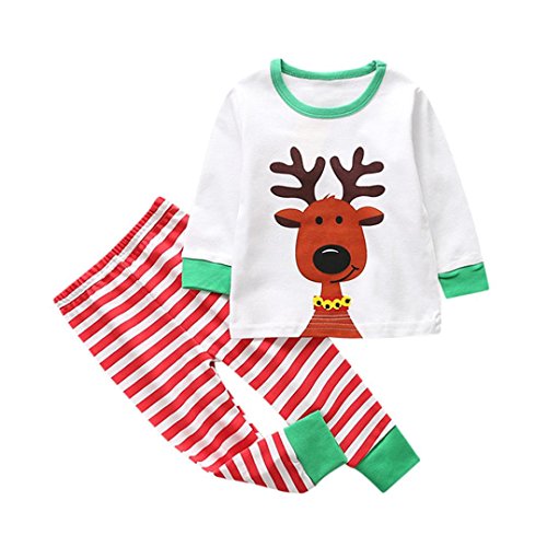 ?Description: ?Features: ?1.It is made of high quality materials,Soft hand feeling, no any harm to your baby's skin ?2.Stylish and fashion cartoon deer print and stripe design make your baby more attractive ?3.Great for?casual, Daily,?party?or photoshoot, also a great idea for a baby show gifts ?4.Such a sweet Christmas clothes for your baby.There's no doubt in our mind your little baby will be the cutest tot of them all. ?Product information: ?Gender:Girls,Boys ?Material:Cotton Blend ?Suitable for season:Spring,autumn,winter ?Clothing Length:Regular???? ?Pattern Type:DeerStripe ?Decoration:None ?Sleeve length:Long sleeve ?Style:Cute ?Collar:O-neck ?Occasion:Casual,Daily ?Both hand wash and machine wash is OK ?Package include:1PC Tops 1PC Pants ?Please note that slight color difference should be acceptable due to the light and screen. ?Size Chart For Baby (Unit:cm/inch/1 inch = 2.54 cm) ?Size:12M===Label Size:80===Bust:52cm/20.5"===Tops Length:31cm/12.2"===Pants Length:40cm/15.7"===Height:80CM ?Size:24M===Label Size:90===Bust:54cm/21.3"===Tops Length:34cm/13.4"===Pants Length:46cm/18.1"===Height:90CM ?Size:3T====Label Size:100===Bust:56cm/22"====Tops Length:37cm/14.6"===Pants Length:52cm/20.5"===Height:100CM ?Size:4T====Label Size:110===Bust:58cm/22.8"===Tops Length:40cm/15.7"===Pants Length:58cm/22.8"===Height:110CM ?Size:5T====Label Size:120===Bust:60cm/23.6"===Tops Length:43cm/16.9"===Pants Length:64cm/25.2"===Height:120CM 0