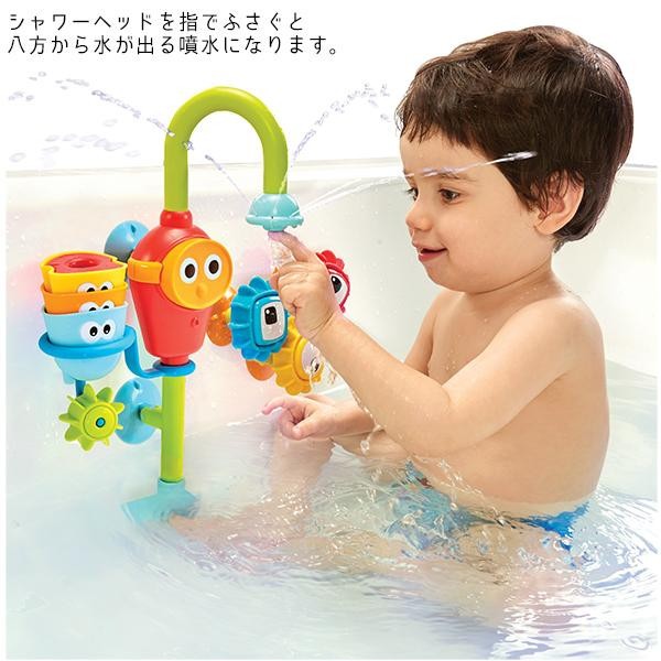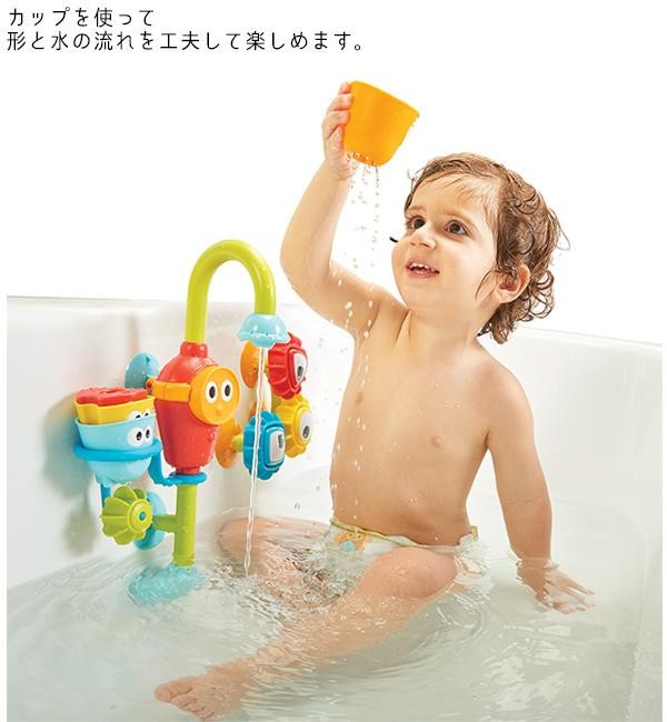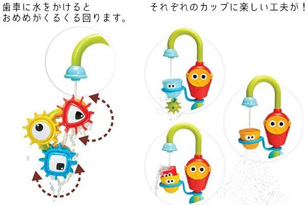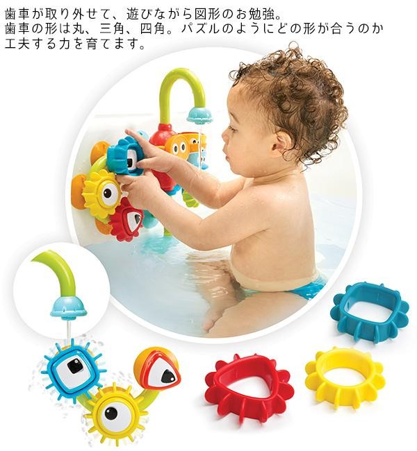 | 電池の力で水をくみ上げて流れ落ちる水の変化を楽しみながら、歯車で図形の勉強もできるお風呂おもちゃです。浴槽の壁に吸盤で設置。水中めがねのボタンを押すだけの簡単操作。 |