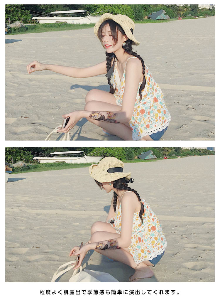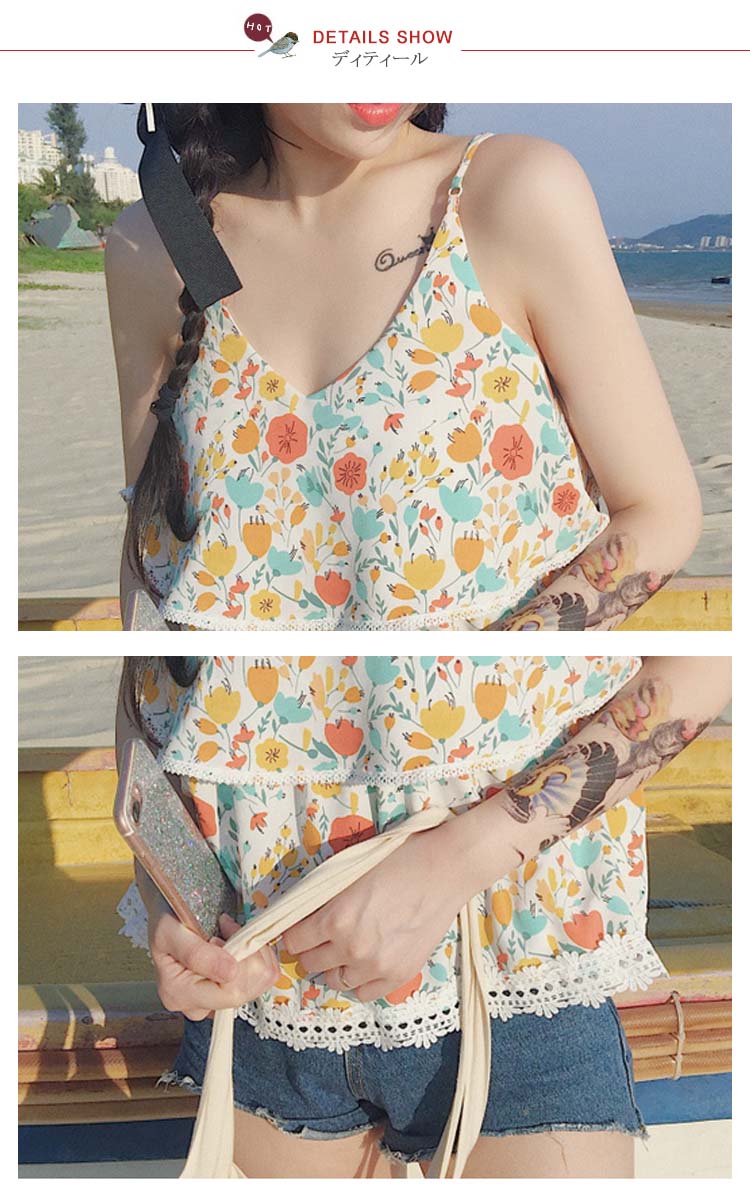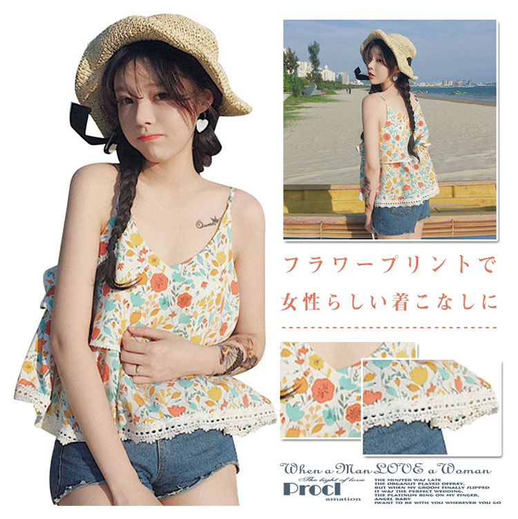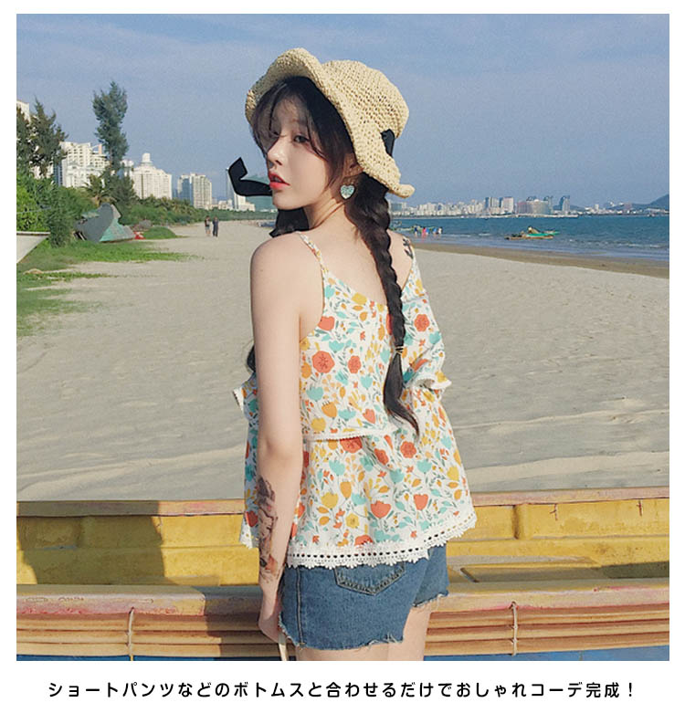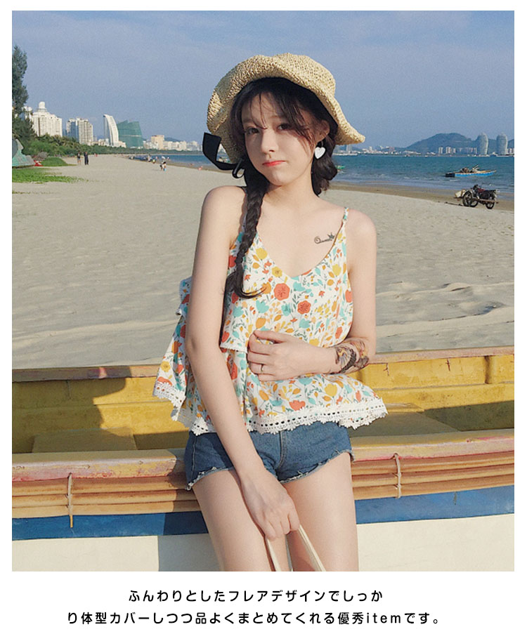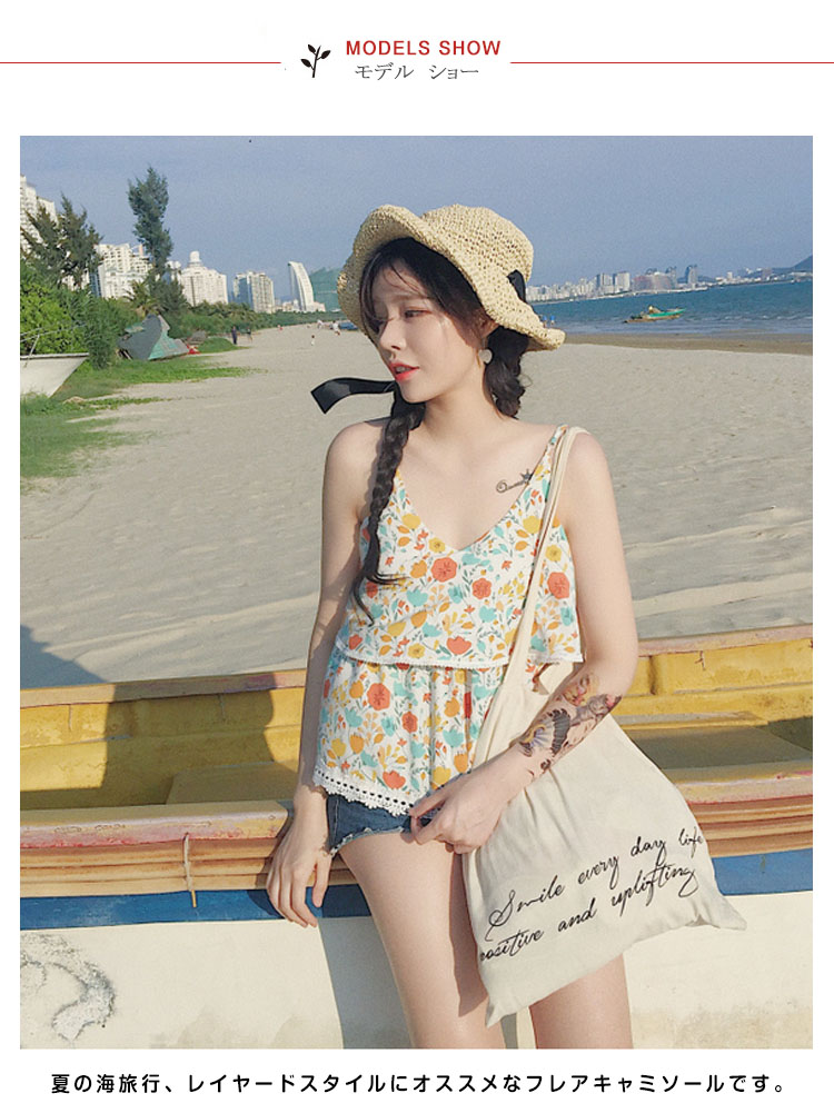 | フラワープリントで女性らしい着こなしに。夏の海旅行、レイヤードスタイルにオススメなフレアキャミソールです。ふんわりとしたフレアデザインでしっかり体型カバーしつつ品よくまとめてくれる優秀itemです。程度よく肌露出で季節感も簡単に演出してくれます。ショートパンツなどのボトムスと合わせるだけでおしゃれコーデ完成! | |