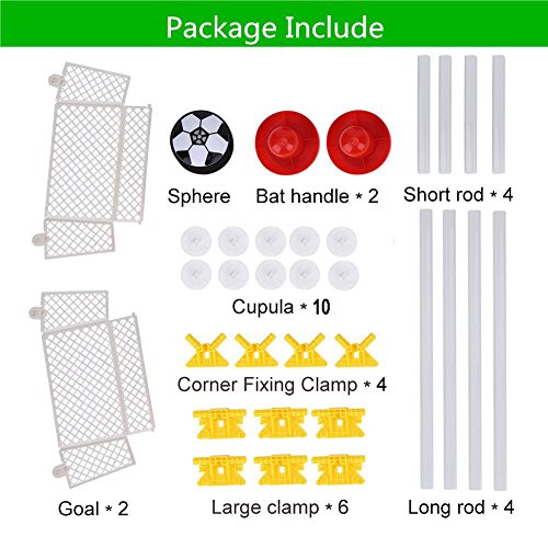 Material: ABS Long Pole Length: Approx. 35cm/13.7' Short Pole Length: Approx. 15cm/5.9' Goal Height: Approx. 8.5cm/3.3' Installed Total Size: Approx. 70 x 40cm/27.5 x 15.7' Battery: 2 x AAA Battery (not included) Weight: Approx. 430g Packing List: 2 x Goal 2 x Bat Handle 10 x Cupula 1 x Sphere Soccer 6 x Large Clamp 4 x Corner Fixing Clamp 4 x Short Rod 4 x Long Rod Notice: Please notice that the battery is not included. 0