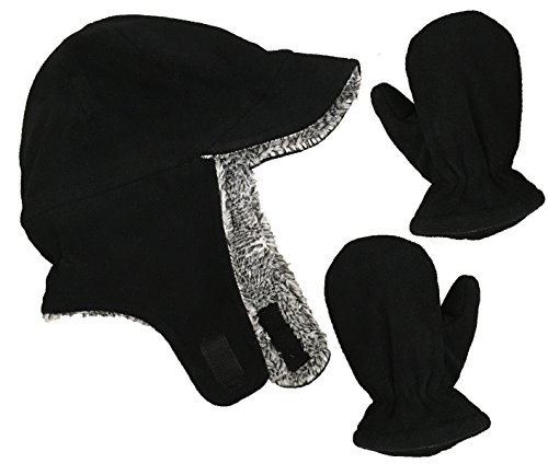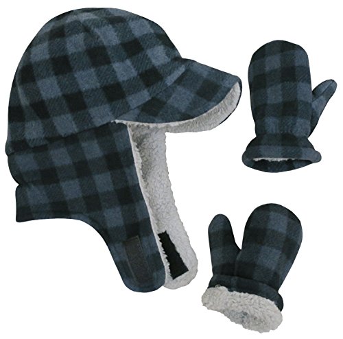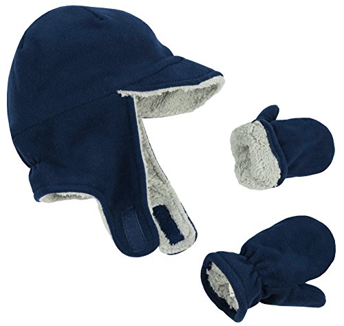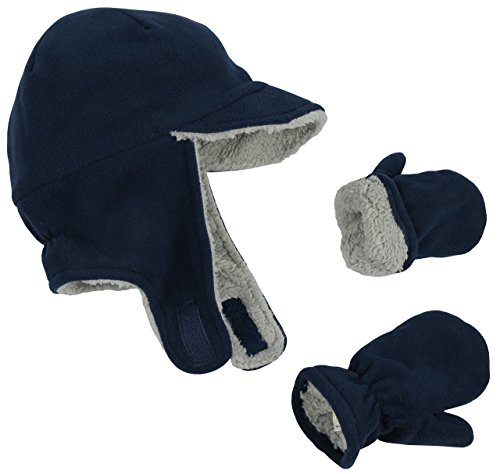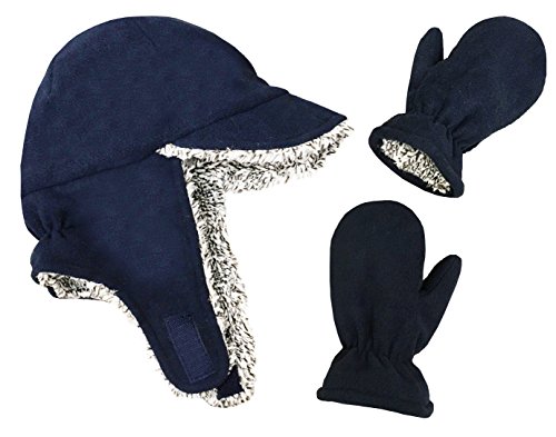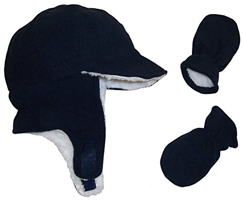Binding : Apparel Product Description N'Ice Caps boys sherpa lined jockey style hat and mitten set. Has velcro on large ear flaps, full sherpa lining, elastic on mitten wrist. 100% poly. Color: navy/natural sherpa. Available in 3 sizes. One size fits 12-18 months, one size fits 2-3 years, one size fits 4-6yrs. For size 12-18 months, the mittens do not have thumbs. For sizes 2-3 years and 4-6 years, the mittens have thumbs. This product has been tested and approved as per CPSIA standards. 0