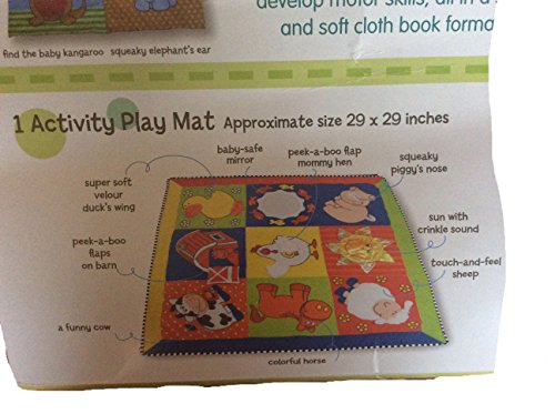 Your child will love this soft cloth Farm activity play mat. The touch-and-feel elements, peek a boo flaps, baby safe mirror and colorful animals will encourage exploration and stimulate early learning.