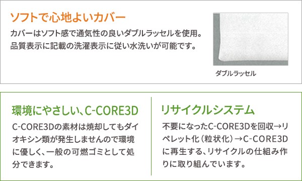 | 素材・材質 | 【中材】 ポリエチレン 【カバー生地】 アウターカバー:ダブルラッセル、インナーカバー:ゴース |