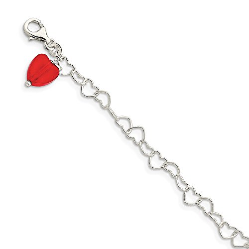 Solid 925 Sterling Silver Red Synthetic Crystal stone Heart Link Anklet 10" - with Secure Lobster Lock Clasp (5mm)