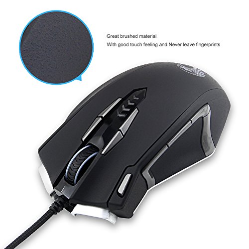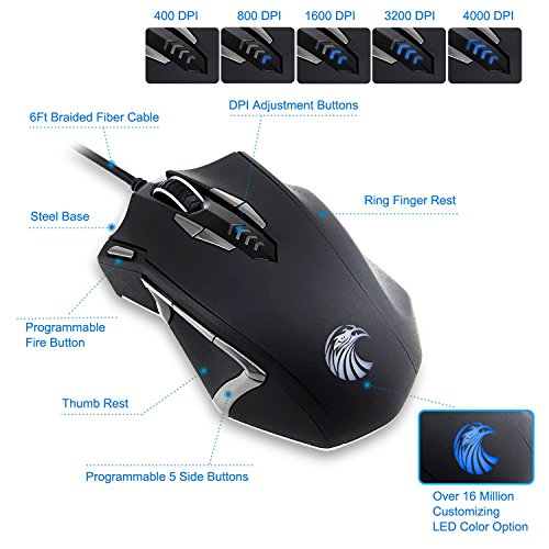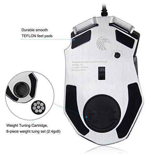 -. Feature : Built with gamers in mind: up to 4000 DPI, 1000 Hz polling rate, 20G acceleration, 100-150in/s cursor speed, and an Avago sensor. Omron micro switches provide crisp, firm clicks. Special Aluminum Metal Base adds heavier feel during game playing. / 13 programmable buttons, 5 Savable memory profiles each with a distinct light color for quick identification, an 8-piece weight tuning set (2.4g x8), and over 16 million LED color options. The LED may be disabled as per your preference. / Durable smooth TEFLON feet pads and contour body for ultimate gaming control. High-end features including 14 buttons, power button, breathing light in 5 colors modes and 5 side buttons. / Ergonomic Right Handed Design with Rubber Painting Surface that can keep your grip firm during gameplay. 6ft braided-fiber cable with gold-plated USB connector ensures greater durability. / Special Setting Switch Button on the back side of the mouse let you take command with maximum efficiency.