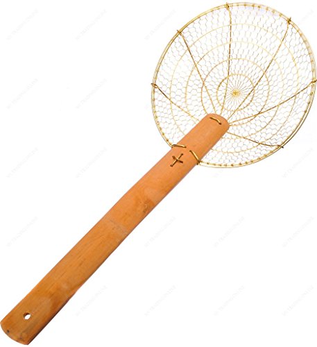 Studio : M.V. Trading Publisher : M.V. Trading Product Description This easily washable noodle skimmer has coarse mesh wires with outer framework and comes with a bamboo handle. It has a round, flat concave net strainer to hold the noodles. The concave net not only secures the noodles but is also used for straining water, oil and other elements. It also has a built in hook hanger for storage or hanging up the pot. A unique, handsome, and practical Chinese skimmer with brass wire mesh and a long bamboo handle. There is no substitute for this tool that lifts out pasta, wontons, ravioli, and tortellini from boiling water or fried foods from hot oil. The most handy, versatile, useful, durable, and inexpensive utensil in any kitchen and some even use it in the kitty litter box. 0