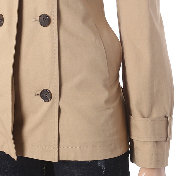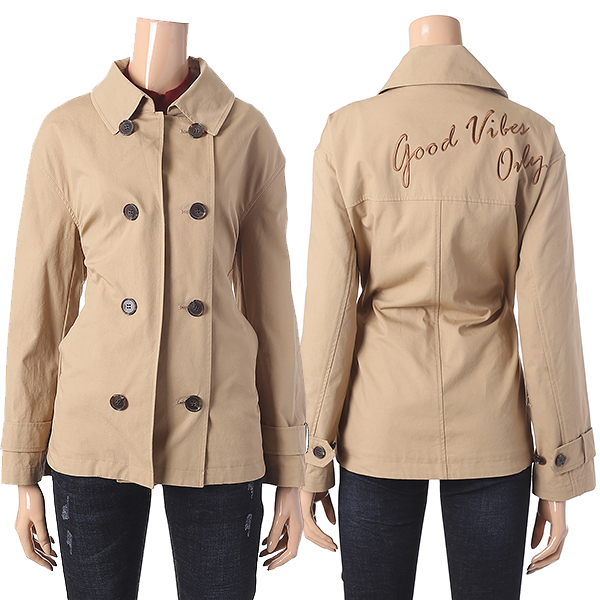 베이지 컬러에 더블 단추 장식과 뒷 자수 레터링 디테일로 포인트를 준 트렌치 코트 입니다. 힙을 살짝 덮는 길이감으로 유니크한 분위기를 연출해 줍니다.