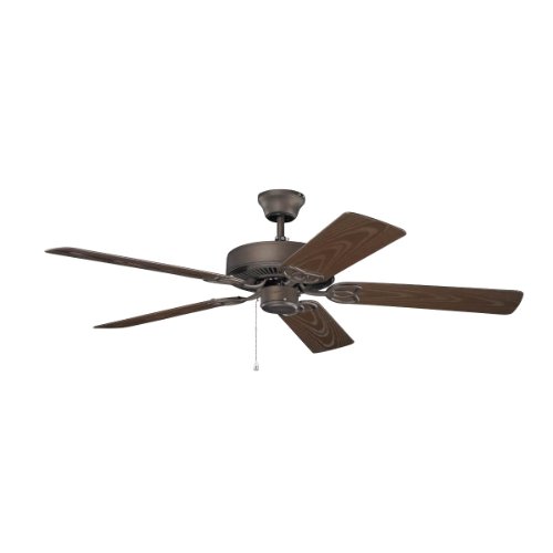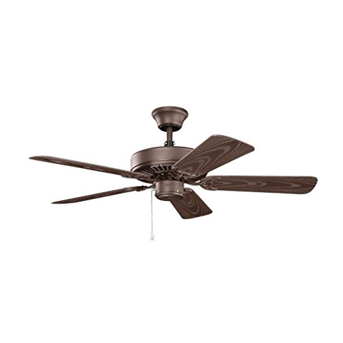 Kichler Lighting 414SNB Basics Patio 42IN Damp Rated Ceiling Fan comes in a rich Satin Natural Bronze finish with complementing Brown all-weather ABS blades. This ceiling fan is light kit compatible, and there are many different varieties to choose from to purchase separately from Kichler Lighting. The 42IN blade span is perfect for areas less than 100 sq. ft: Bedrooms, Entry, Kitchen, etc. It can be installed on a mounting slope of up to 30-degrees (with use of the included downrod), and has a hanging weight of only 17.60-pounds. The strong 153MM x 10MM AC motor uses .40 AMPs on high, and 210 RPMs on high, with Airflow of 3962 cubic ft. per minute on high and an Airflow Efficiency of 83 cubic ft. per minute per watt, and the blades have a 12-degree pitch. It uses only 48 watts on high. Optional 370039MUL, 370032MUL, 337001WH, 337010WH/IV/ALM, 337011WH/IV/ALM, 337012WH/IV/ALM, or 337214 fan controls are available, and can be purchased separately. The 414SNB is 12.75IN high (using the shortest downrod included). The 414SNB comes one per package, includes one (1) 4IN downrod, and five (5) wood blades. Since 1938, Kichler Lighting has offered a distinctive array of lighting solutions that reflect your individual personality, tastes and plans. Kichler brings you an unparalleled variety of exciting style families, unique finishes, fresh colors and unequaled quality. Whether it's casual, contemporary, transitional or traditional, you'll find it with Kichler, lighting that defines your style.Feature
