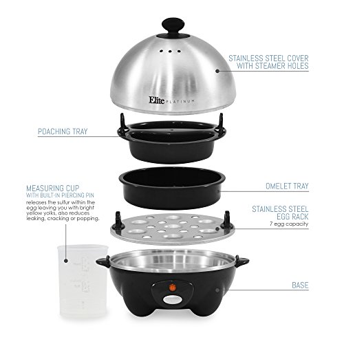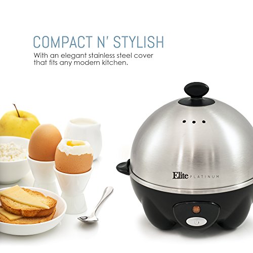 The Automatic Easy Egg Cooker allows you to cook up to 7 eggs at one time. An included measuring cup allows you to calibrate the water level to consistently prepare the eggs to your desired style; soft, medium, or hard boiled. In addition to steaming, this egg cooker allows you to gently poach two eggs with the included poaching tray. A convenient automatic shut-off indicator light lets the user know exactly when the cooking cycle is complete. The built-in timer adjusts automatically from soft to hard and cooks eggs exactly to your liking! Also included is a measuring cup with a built-in piercing pin to prevent cracked shells during cooking. It also allows you to pierce the eggs prior to cooking to release the sulfur within the egg. The result is consistently perfect golden yellow yolks. Gone are the days of undercooking or overcooking your eggs! Hand wash recommended. Voltage of 120V.Feature