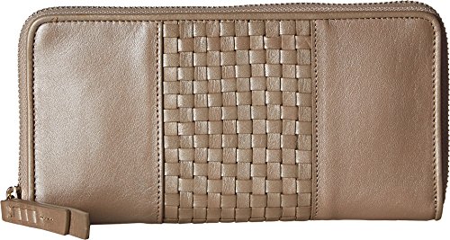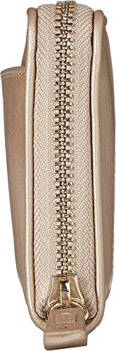 Lined interior features one zip pocket, 12 card slots, and currency slip pockets.