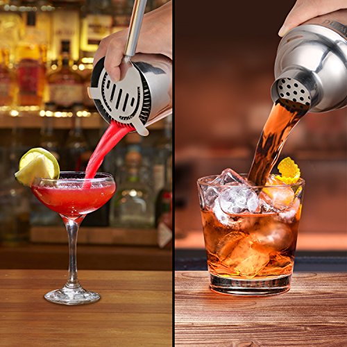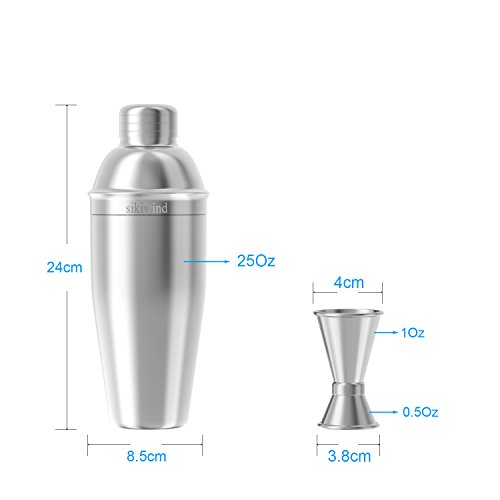 Product Description 7pcs Sikiwind Cocktail Shaker Set for All Your Cocktail Mixing Needs. The bartender set that is durable, premium quality, not rust or leak. Easy to use and clean. perfect for any drink of your choosing. Bar Set Accessories: - 750 ML Stainless Steel Cocktail / Martini Shaker - Double Size 1 and 1/2 oz. Jigger - Cocktail strainer - Ice Tongs - Stainless Steel Mixing Spoon - Stainless Steel Drink Muddle - A Recipes Booklet Benefits of the Bar Set - Can make any drink including mojito, martinis, and other mixed drinks. - Bar Tool Set are dishwasher safe. - Stainless steel martini shaker built-in Strainer, you can direct pouring the mixer, also you can use the cocktail strainer. -It is well balanced and feels great in your hand, certain to be the most used piece of your bar equipment. 0