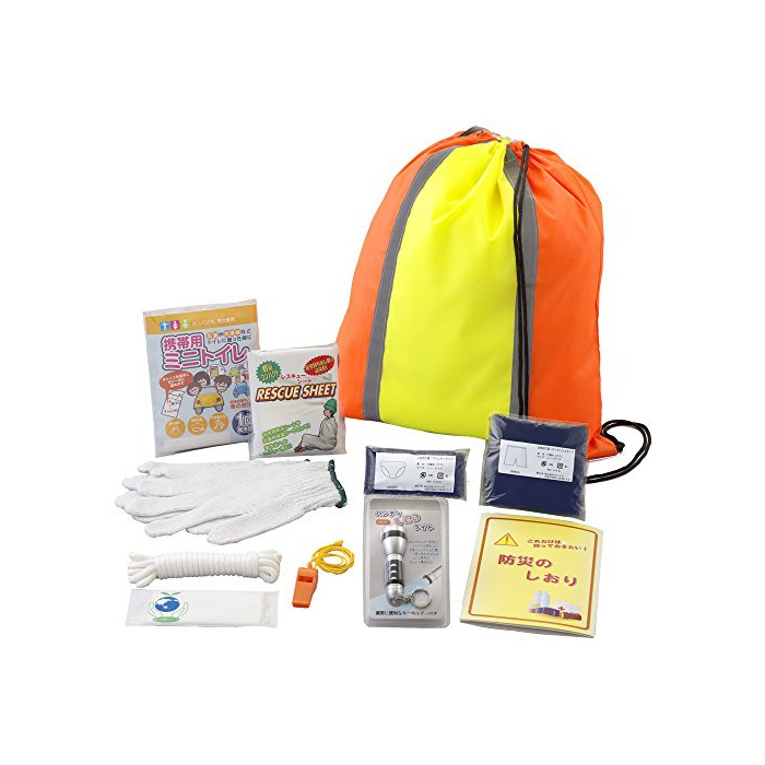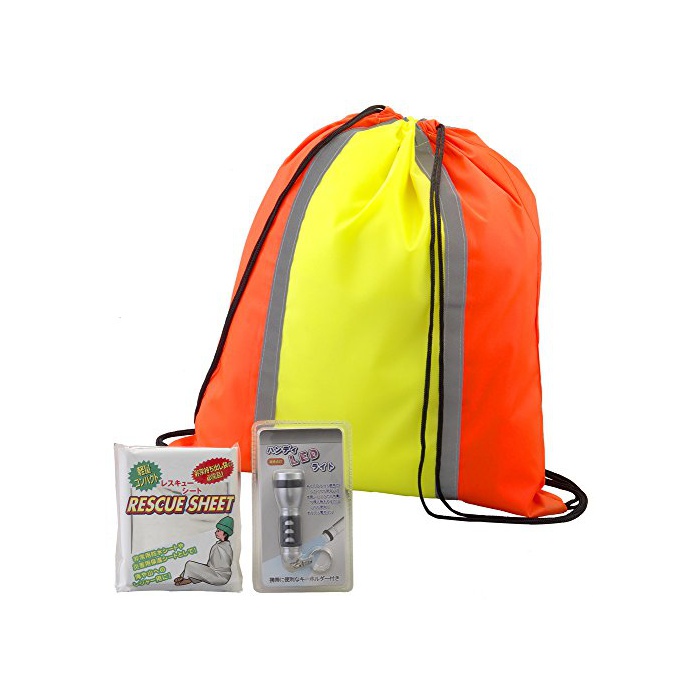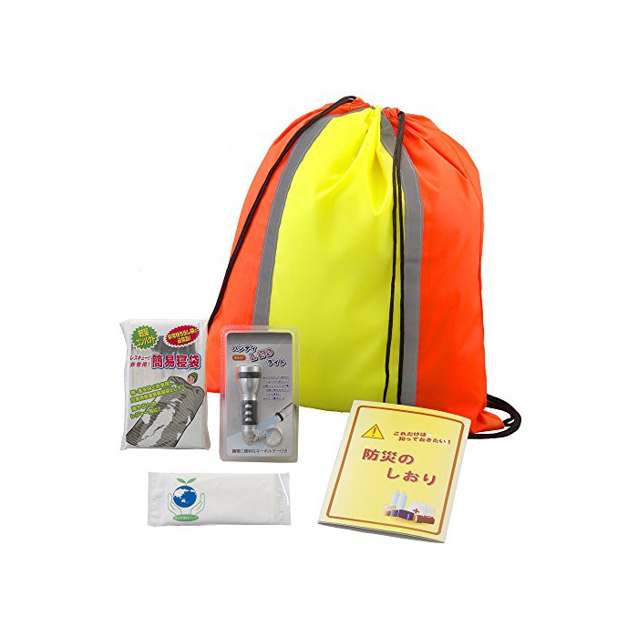 세트 내용:형광 배낭 백,로프,구출 씨트,피리,에코 편리 백,목장갑,신휴대용 미니 화장실,방재 책갈피(안내서),핸디LED라이트(LR41×4개/모니터용 전지 내장)고, 비상용 속옷1P트렁크 타입,비상용 속옷1P빵 T 타입