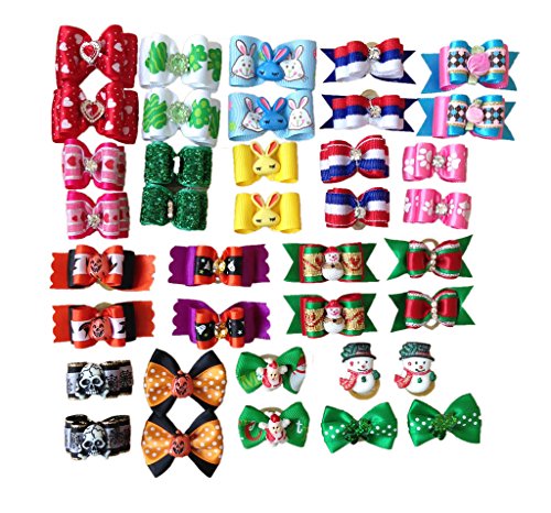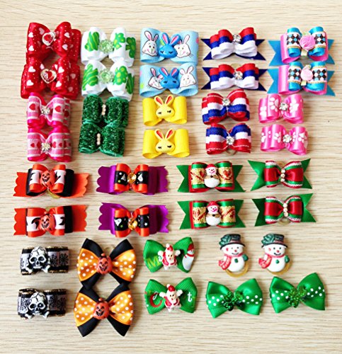 -. Feature : Beautiful and cute hair bows with rubber bands for pet dogs,cats,farm animals and toy dolls. / They include 20pairs hair bows to fit for important festivals: 3pairs for daily style, 2pairs for Valentine's Day, 3pairs for St . Patrick's Day, 2pairs for Easter Day, 2pairs for Independence Day, 4pairs for Halloween Day, 4pairs for Christmas Day. / Please note: there are a lot of daily, Halloween and Christmas styles, we'll send them them randomly. So the color and design may have a little difference with the pictures. But please don't worry. They are all very beautiful. Please understand. Thanks. / Great pet gift dog hair bows for groomers and pet owners. / It can make your pet look more fashionable and attractive.