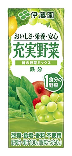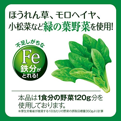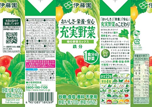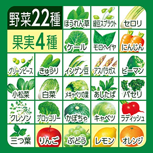 原材料:野菜汁(ほうれん草、緑豆スプラウト(もやし)、セロリ、ケール、モロヘイヤ、にんじん、グリーンピース、きゅうり、インゲン豆、アスパラガス、ピーマン、小松菜、白菜、メキャベツの葉、あしたば、パセリ、クレソン、ブロッコリー、かぼちゃ、キャベツ、ラディッシュ、三つ葉)、果汁(りんご、ぶどう、レモン、オレンジ)、りんごエキス/ピロリン酸第二鉄、ベニバナ黄色素、クチナシ色素