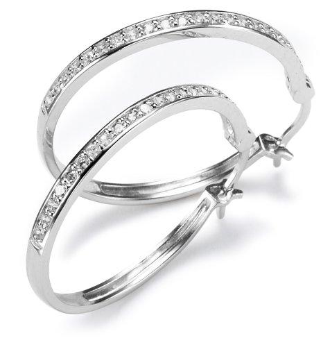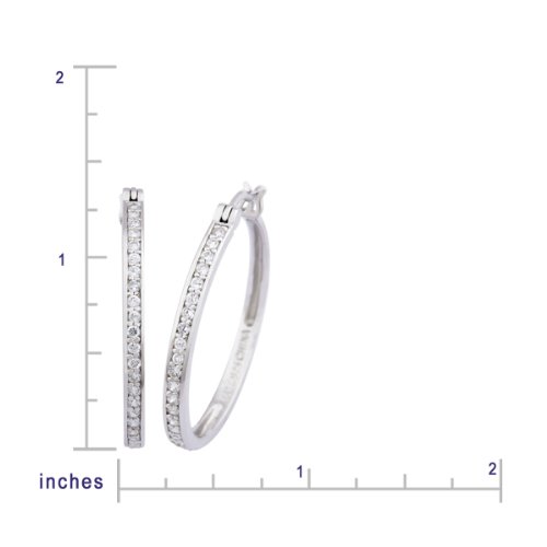 A row of channel-set cubic zirconia stones adds sparkle to these classic sterling silver hoop earrings. The 30 mm hoops are set on hinged posts that snap into U-shaped grooves for a simple and secure closure. Offering a touch more dazzle than your standard hoops, but still simple enough for everyday wear, these stylish hoops pair easily with any outfit.