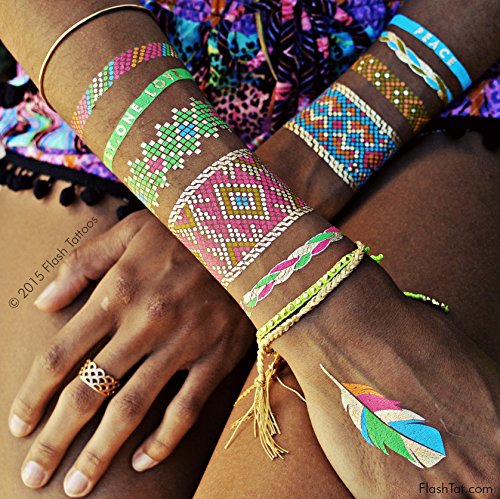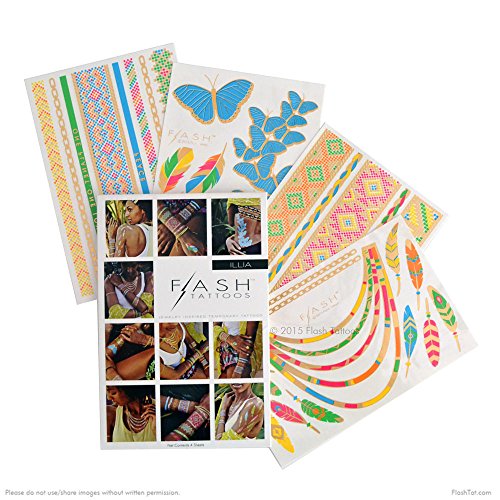 Flash Tattoos Illia Authentic Metallic Temporary Tattoos 4 Sheet Pack (Black/gold/silver/white) - Includes Over 34 Colorful Premium Waterproof Tattoos