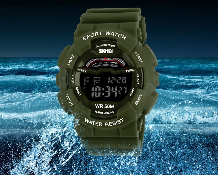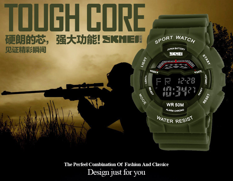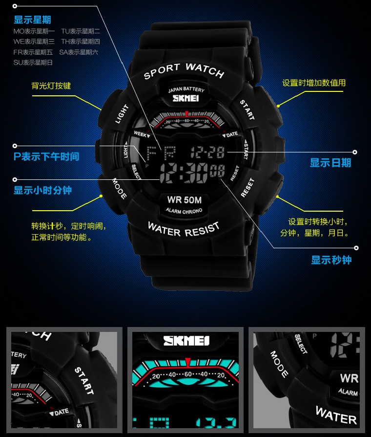 | Many Function Jam tangan SKMEI memiliki fungsi seperti penunjuk hari dan bulan、 stopwatch、 waterproof dan stopwatch.