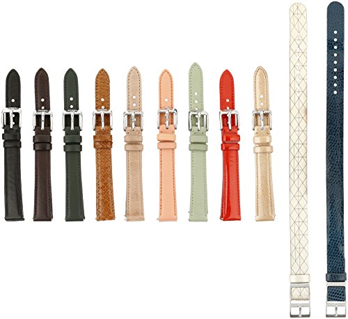 Set includes 11 additional leather straps in patent, bright, and neutral