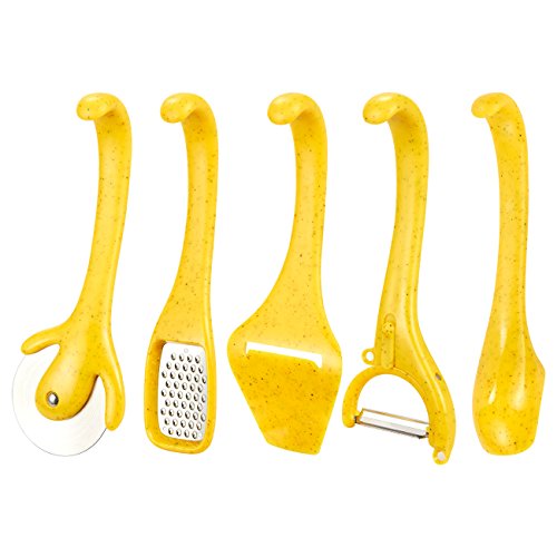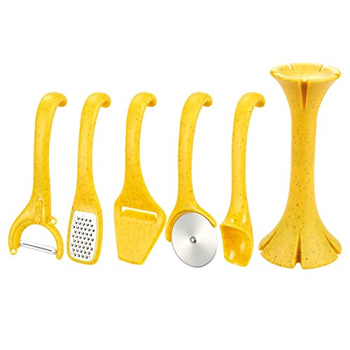 -. Feature : ESSENTIAL KITCHEN TOOLS: This set of nylon kitchen tools includes 6 pieces in total: 1 grater, 1 peeler, 1 cheese slicer, 1 pizza cutter, 1 ice cream scoop, and 1 free standing solid utensil holder / MUST HAVE FOR ANY KITCHEN: Each piece in this kitchen tool set can do wonders in any modern kitchen, like the peeler for any vegetables, hard cheeses, carrots, potatoes, courgettes, and zucchinis you may find yourself cutting through with ease! The ice cream scoop fits a wide range of hand sizes and the curved and smooth handle makes the scoop safe for children to use. Ideal for frozen ice cream, gelato, sorbet, Italian ices and low-fat frozen yoghurt! / QUALITY CONSTRUCTION: Thanks to their nylon material, these tools are lightweight and shatterproof. With the complimentary holder, these tools will look decorative and functional in any kitchen no matter the decor! / BONUS HOLDER: The accompanying standing holder is designed to provide a stable storage place for each utensil and provides easy access to any utensil when needed / DIMENSIONS: Pizza Cutter: 8.2 x 1.5 x 3 Inches; Grater: 8.25 x 1.6 x 2; Peeler: 7.5 x 1.5 x 2.9 Inches; Ice Cream Scoop: 8.2 x 2 x 1.7 Inches; Cheese Slicer: 8 x 1.7 x 3 Inches; Stand: 8.7 tall x 3.8 diameter
